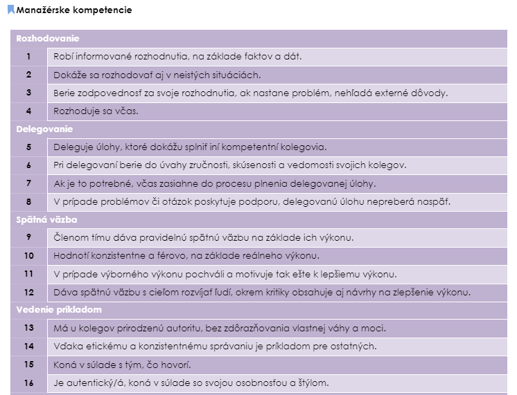 Vybrané opisy správania pre manažérske kompetencie môžu byť napríklad: